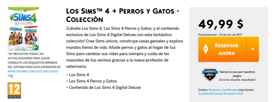 En la web de EA han puesto disponible para reserva un nuevo pack del juego con Los Sims 4 (juego base) + la nueva expansión Perros y Gatos.
